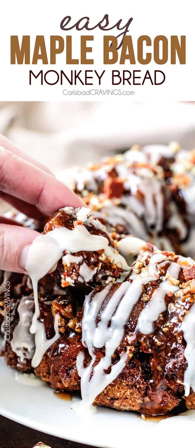 Today, you can see every type of variation from Pillsbury biscuit dough monkey bread, cinnamon roll monkey bread, pretzel monkey bread, pizza monkey bread, crockpot monkey bread and on and on.ย But my favorite?ย This Cinnamon Roll Monkey Bread with Maple and Bacon!