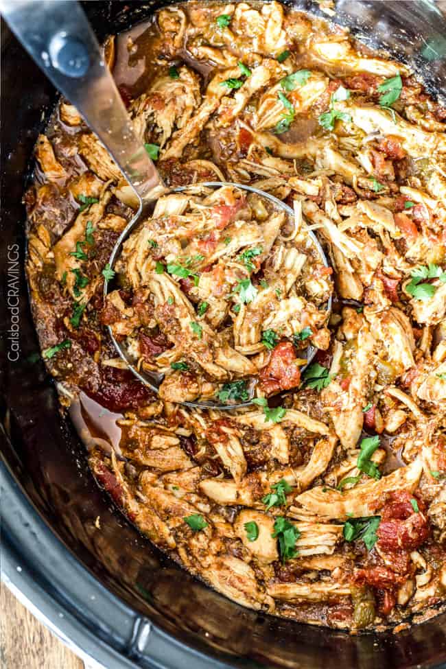 - Shred the chicken and let it cook on low for an additional 20 minutes to absorb some of the liquid/juices.