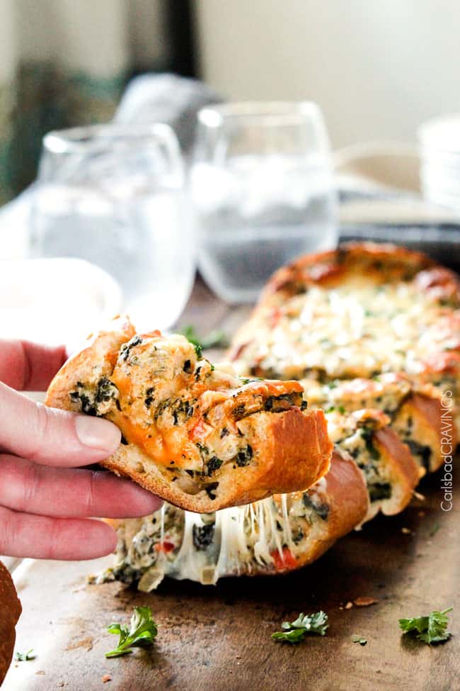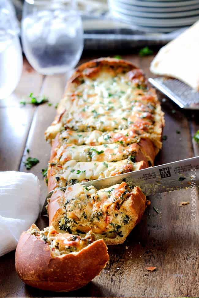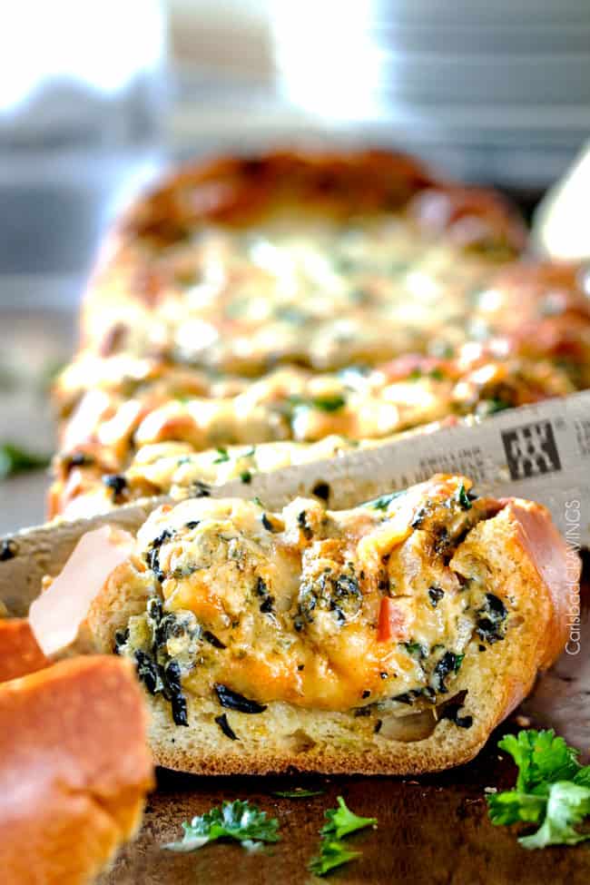 Or I should say party dance commence because its all about the party. ย And this Spinach Dip Stuffed French Bread will be the life of the party. ย Or just the reason to party ย โ should you need one.