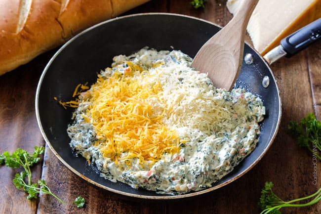 Mixing together spinach, sauteed onion, bell peppers, garlic, pesto and a splash of paprika that you creamify by stirring in sour cream, mayonnaise and cream cheese. ย And then comes glorious Parmesan cheese, sharp cheddar cheeseโฆ
