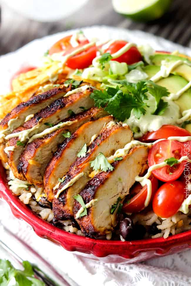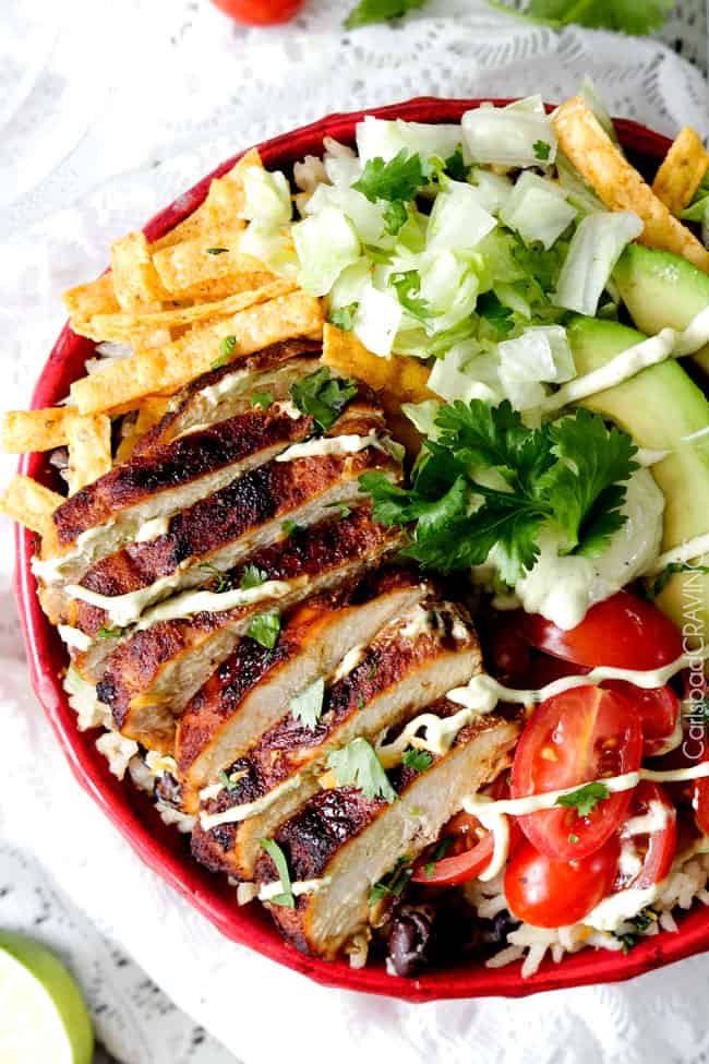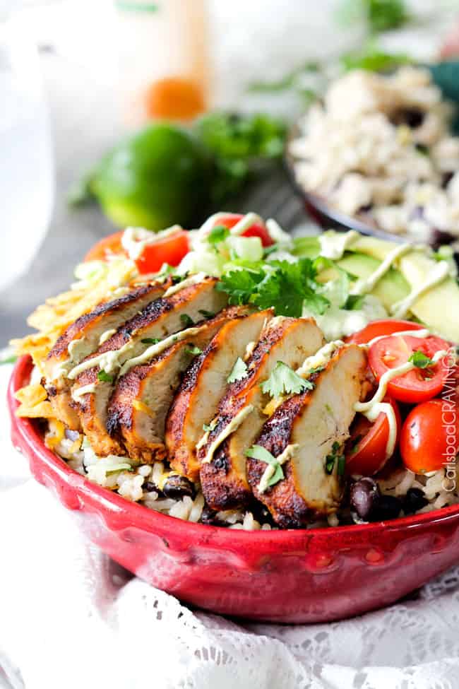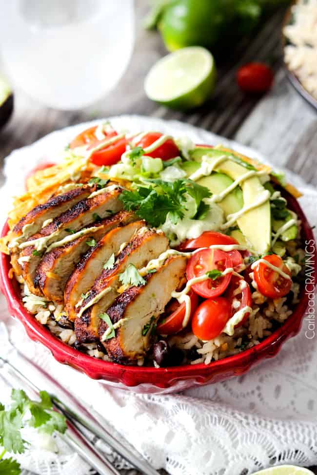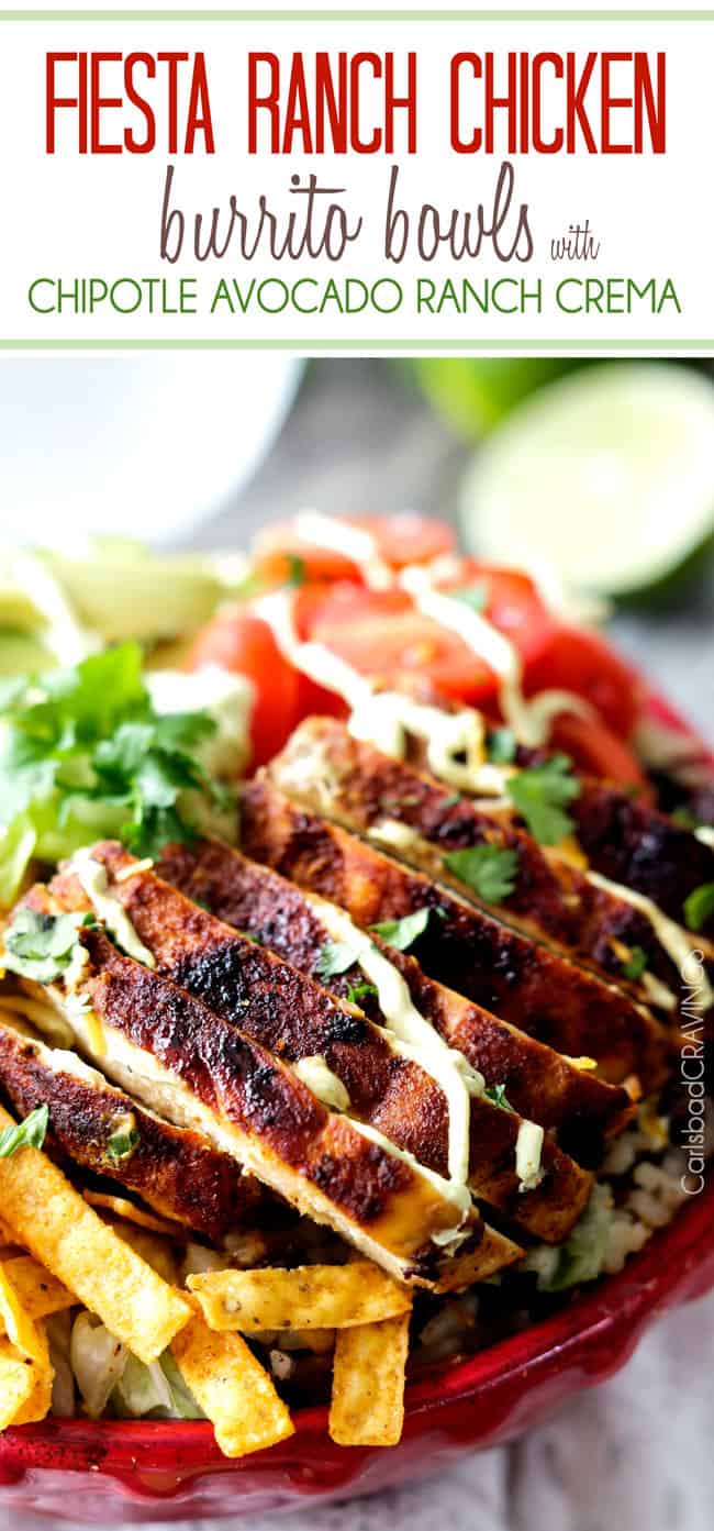 ย Fiesta Ranch Chicken Burrito Bowl piled with tender, marinated fiesta ranch chicken, cheesy one pot Cilantro Lime Rice with black beans, guilt free Chipotle Ranch Avocado Crema and all your favorite burritoย fixinsโ.ย You are going to want a very big bowl.ย
