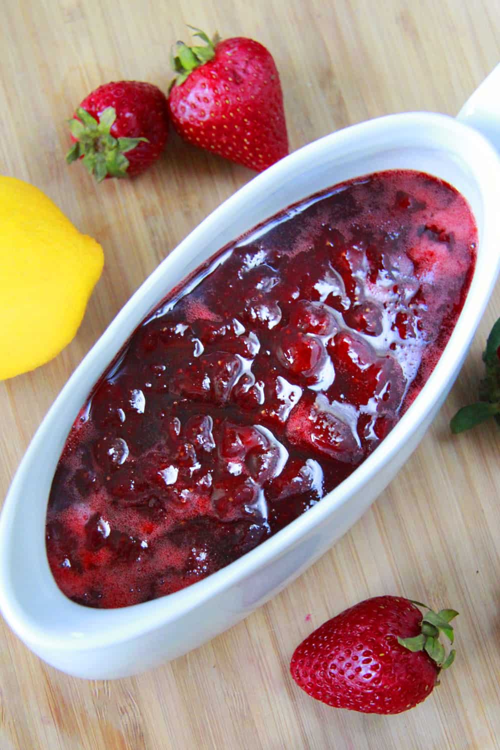 Homemade Fresh Strawberry Syrup (Sauce) is as easy as throwing the 4 INGREDIENTS into a pot and letting them simmer and it tastes positively heavenly! ย This crazy delicious Strawberry Syrup makes ice cream, pancakes, waffles, crepes, cheesecake etc. taste GOURMET with little effort! ย I love serving this ย for company!