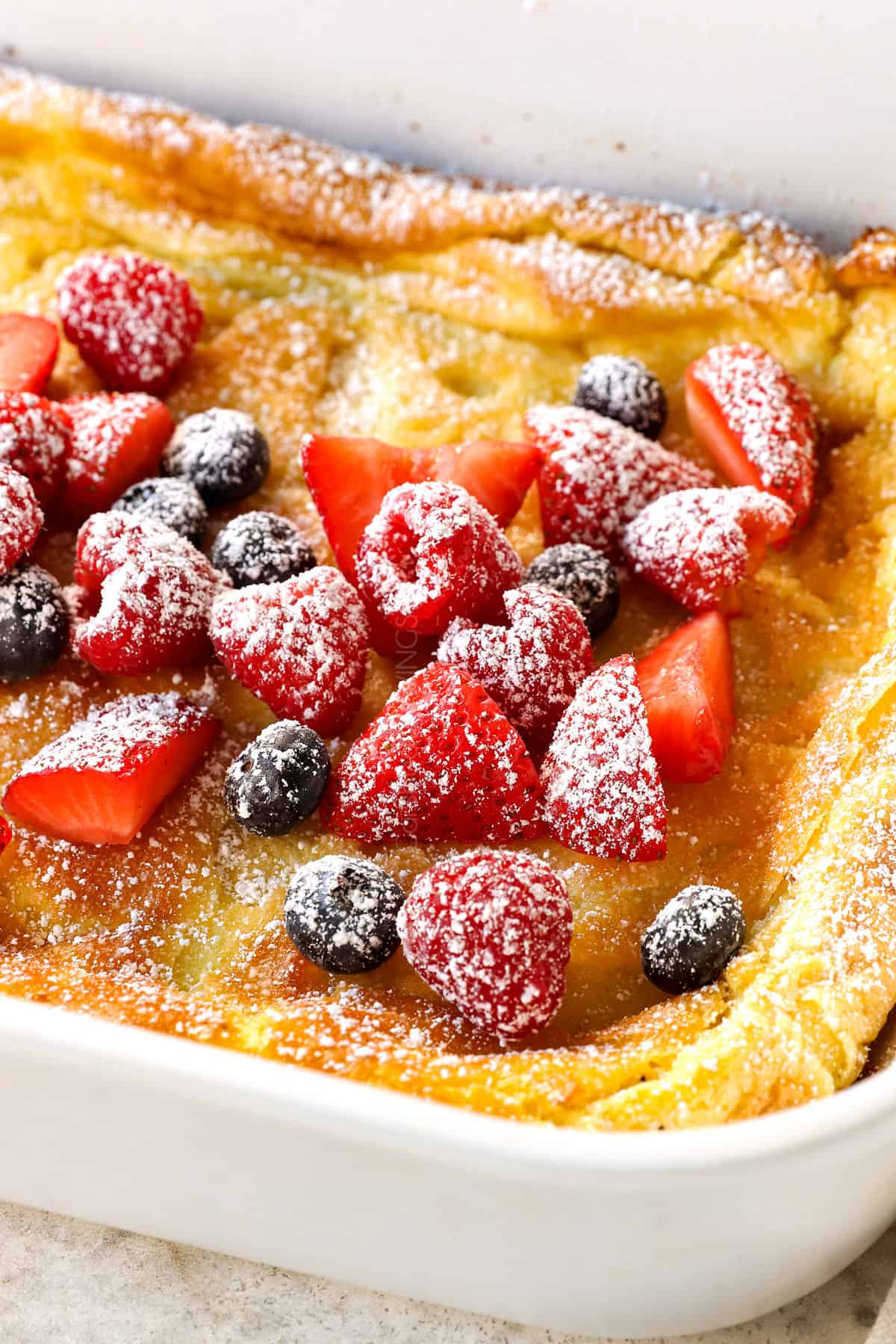 - Fresh fruit:ย Top theย German Pancake recipeย with fresh fruit such as blueberries, strawberries, raspberries, blackberries, bananas,ย mangosย and/or pineapple.