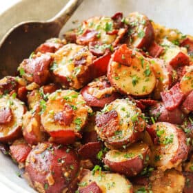 - Make ahead: coat the potatoes with the dressing but hold the bacon.ย Rewarm the potato salad before serving, then stir in the bacon once warmed so it remains crispy. If the salad seems a little dry, drizzle with some olive oil.