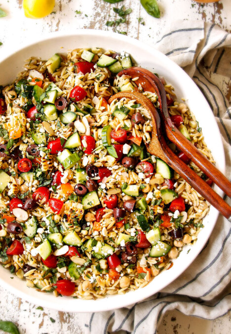 Greek Orzo Pasta Salad:ย light yet filling pasta salad loaded with al dente orzo pasta, crisp cucumbers, juicy tomatoes, crunchy bell peppers, charred, caramelized sweet corn, zippy red onions, tangy Kalamata olives, and salty creamy feta, all brightened by tangy, herb vinaigrette.ย Also make ahead friendly for the perfect stress-free win!