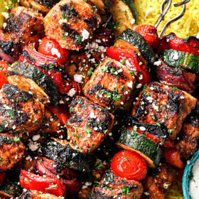 Greek Chicken Kabobs are a meal-in-one with the most insanely tender, juicy, flavorful chunks of Greek chicken and lightly charred veggies โ baked or grilled!