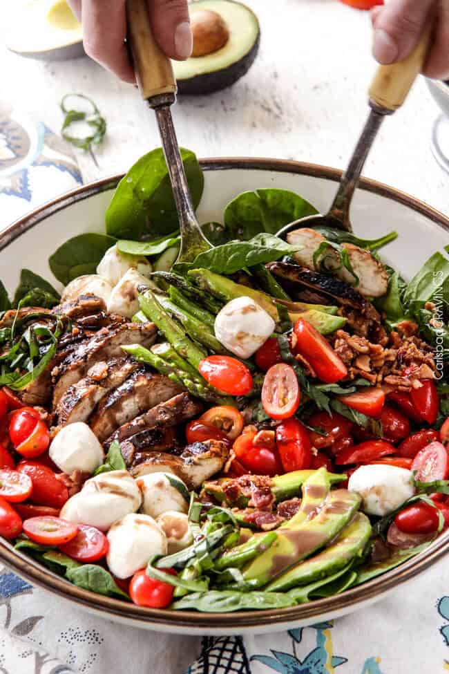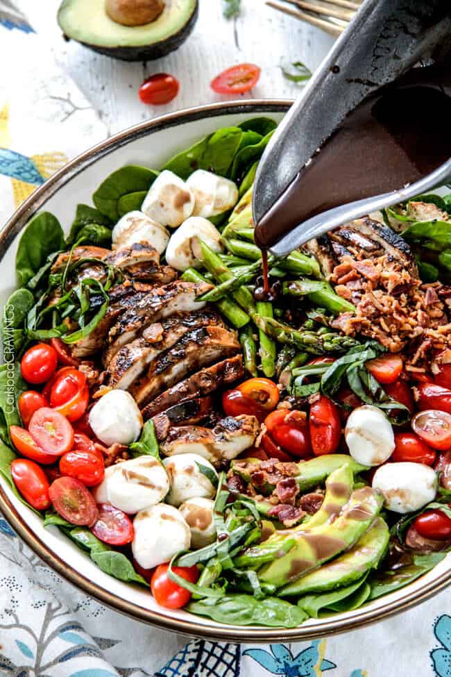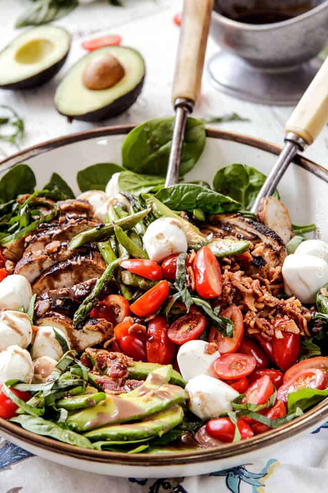 Chicken Caprese Salad with sensational balsamic marinated chicken, fresh tomatoes, melt in your mouth mozzarella, grilled asparagus, creamy avocado and crispy bacon all drizzled with Creamy Balsamic Reduction Dressing =ย Out of this world!ย This recipe will have you craving salad, dreaming about salad and not being able to stop eating salad!ย It is one of my favorite salads of all time and soon to be yours!ย