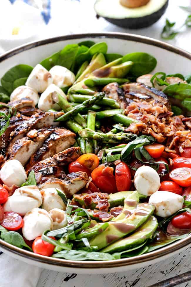 Caprese Chicken Salad with Asparagus, Avocado and Bacon.ย Because itโs grilling season, because every cart counts and because you deserve an insanely delicious salad!
