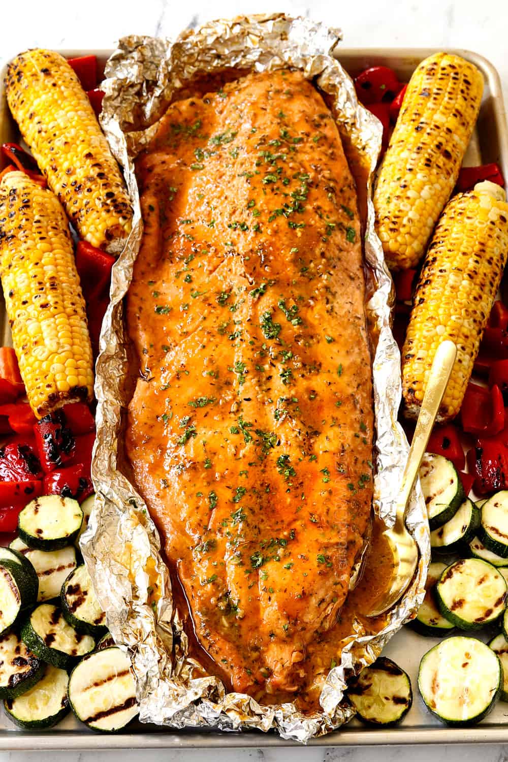 • Use a baking sheet! Adding the salmon to the baking sheet makes for easy transportation of the salmon to and from the grill. The less you have to handle the foil salmon packet, the better, because there will be less chances of it tearing.ย You donโ€™t want to accidentlyย pokeย a hole in theย foil, otherwise the marinade and the juices will seep out and youโ€™ll be left with a mess and less juicy salmon.