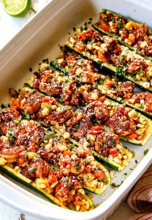 - These Stuffed Zucchini Boats are loaded with juicy, fiesta seasoned shrimp, sweet corn, crunchy bell peppers, punchy red onions, spicy jalapenos all tossed with fresh lime juice and zesty cilantro.ย They are quick, easy, tangy, bright, refreshing, guilt-free, low-carb, and a healthier dinner the whole family will love!ย