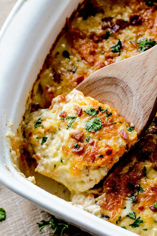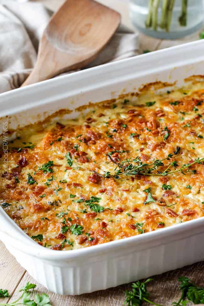 โข Make and do not bake yet: After assembling up to step 5 in the recipe, I cover the dish really well with foil or saran wrap.ย I bag the bacon and remaining cheese in a ziplock and tape to the top of the dish. Refrigerate until ready to bake.ย Let warm up for 30 minutes before baking.ย Bake within 24 to 48 hours of preparation.