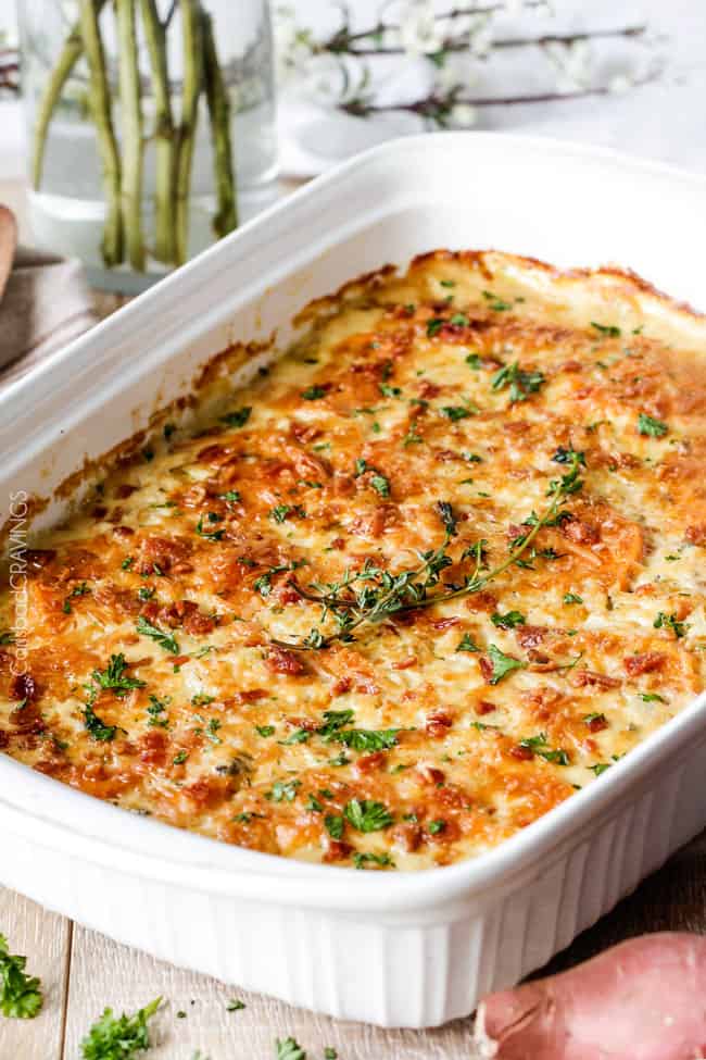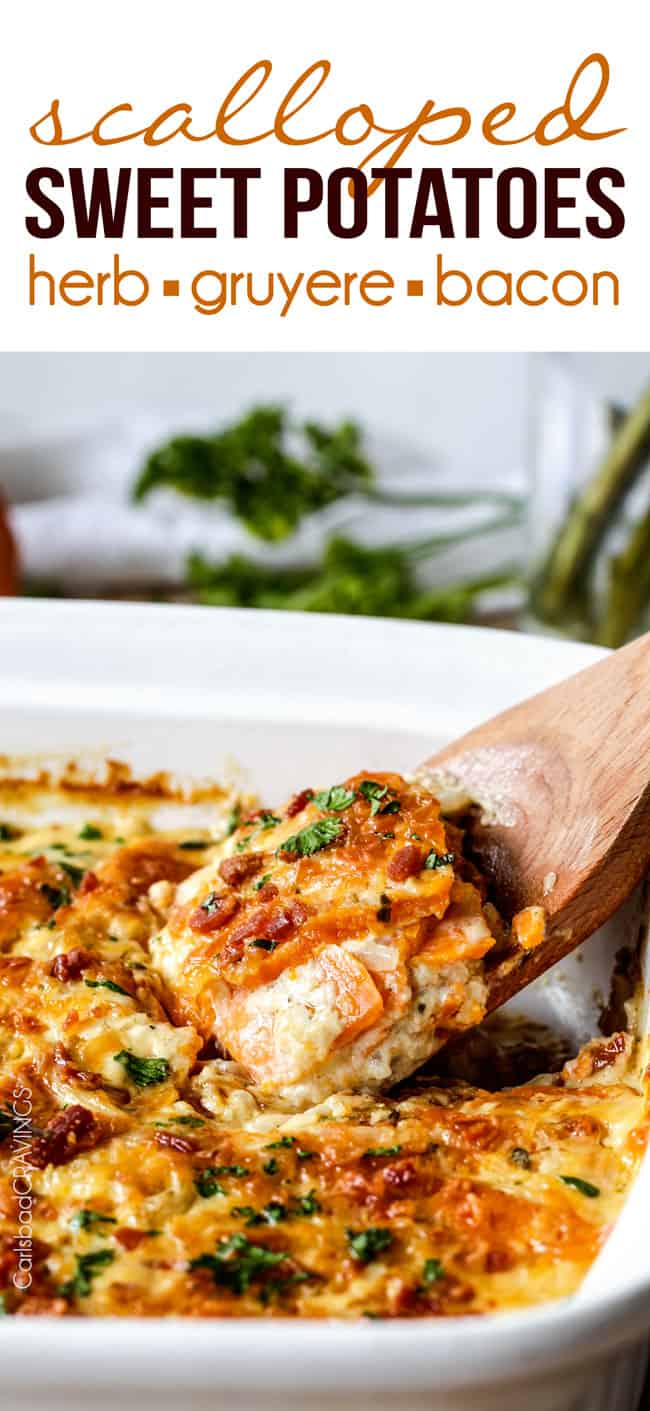 These Scalloped Sweet Potatoes with Bacon and Gruyere are about to become your new favorite sweet potato casserole.ย Theyโre made with herbs simmered in cream poured over layers of sweet potatoes, bacon, onions and Gruyere cheese then baked to tender, golden, bubbly perfection.ย These Scalloped Sweet Potatoes are perfect for Thanksgiving, company or every day!