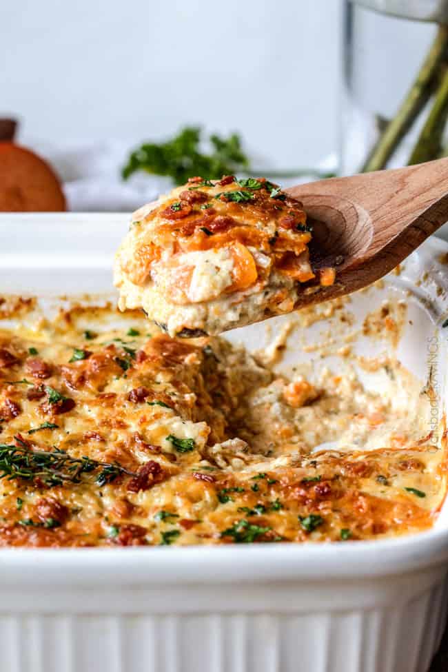 Traditional Scalloped potato recipes use Russet potatoesย orย Yukon Golds.ย Yukons tend to hold their shape a little better and are less mushy (although your sauce will be slightly milkier). Russetsย have the most starch and make the creamiestย sauce.ย Since sweet potatoes are my favorite, I knew I had to try them out as well.