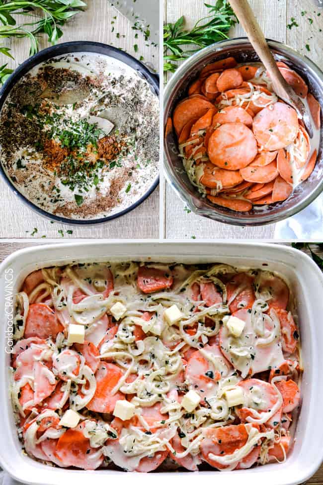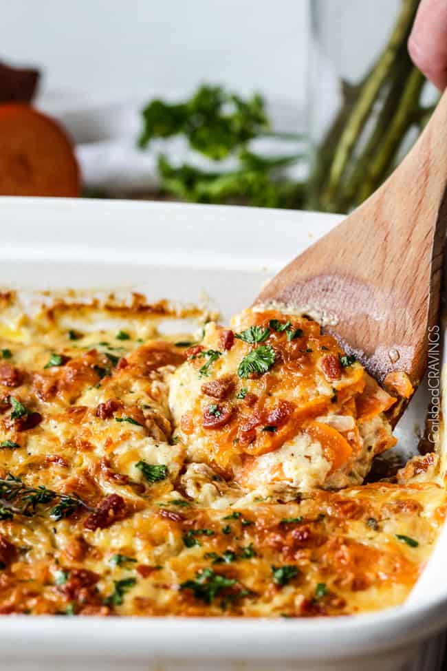 - You then bathe your sliced sweet potatoes in the herbed cream then simply layer some cream, sweet potatoes and onions, bacon and Gruyere a few times and then bake until tender. ย Once tender, smother with the last of the cheese and broil to golden delicious bubbly perfection.