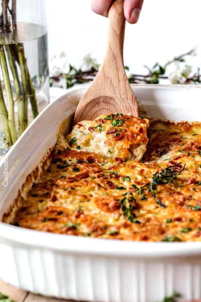 - Using a slotted spoon, layer the bottom of the casserole dish with โ of the potato/onion slices (the slotted spoon will allow you to leave most of the cream in the bowl). Layer 1 cup of the cheese, โ of the bacon then top with โ of remaining cream. Repeat layers.