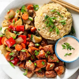 This was delicious, the chicken was crazy tender thanks to the baking soda , I made the rice in the morning and then put it in the freezer for 5 minutes. Hubby said he thought it was yum yum without the yum yum sauce , but the sauce was good too. Havenโt found a bad recipe yet from your site!