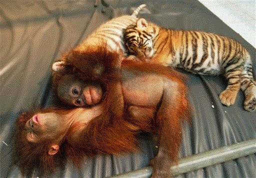 At a Zoo in Indonesia, one-month-old tiger twins and a pair of baby orangutans shared a room in the zooโs nursery. The orangutans and the tigers became the best of friends during daily play times and spent naptime cuddling and nuzzling.