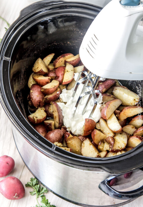 โCrockpot Mashed Potatoes: These potatoes will change your culinary life spiked with pesto and sour cream.ย The recipe is made 100% in the crockpot for megaย creamy, mega flavorful, mega easy, and the perfect side to any meal.ย