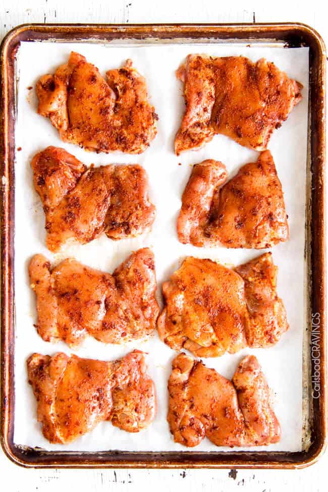 You will want to trim your chicken thighs of excess fat before smothering in the rub. ย I like to use my kitchen shears to make this super quick.