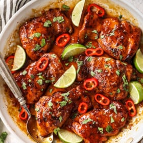 You will fall in love with the flavor and EASE of this Honey Lime Chicken Thighs recipe with its intoxicating sticky tart sauce, bold spice rub and succulent chicken.ย Itโs your answer to โwhat should I make for dinner?โ any time you need an easy, 30-minute, pantry friendly, one skillet recipe that just happens to taste divine.ย
