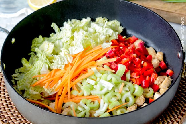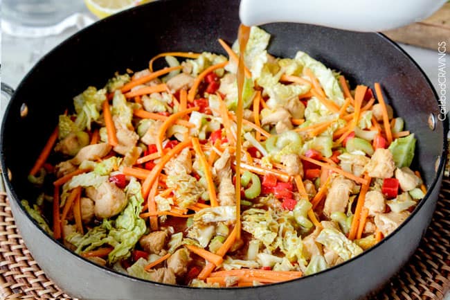 Step 2: Heat 1 tablespoon sesame oil (may sub olive/coconut oil) over high heat in a large skillet. Drain excess marinade from chicken and add chicken to skillet. Saute just until no longer pink on the outside (chicken will finish cooking in the sauce). Add vegetables and saute 2 minutes.