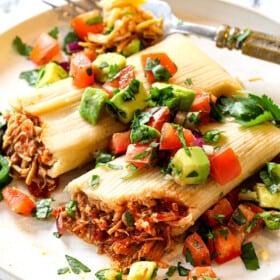 This delicious tamale recipe includes a simple step-by-step tutorial and instructional video on how to make the best Mexican tamales at home โ and they are so much easier than you think. If you can use a mixer and spread peanut butter onto a slice of bread, you can make tamales! ย The fluffy, foolproof masa dough is made with corn oil instead of lard, can be filled with chicken, beef, pork, beans and cheese or vegetables (filling ideas provided), and cooked on the stovetop or in the instant pot.ย ย This tamale recipe is make ahead and freezer friendly for easy weeknight meals or stress-free special occasions. Top your tamales off with some some pico de gallo and serve with Mexican Rice for the perfect meal!