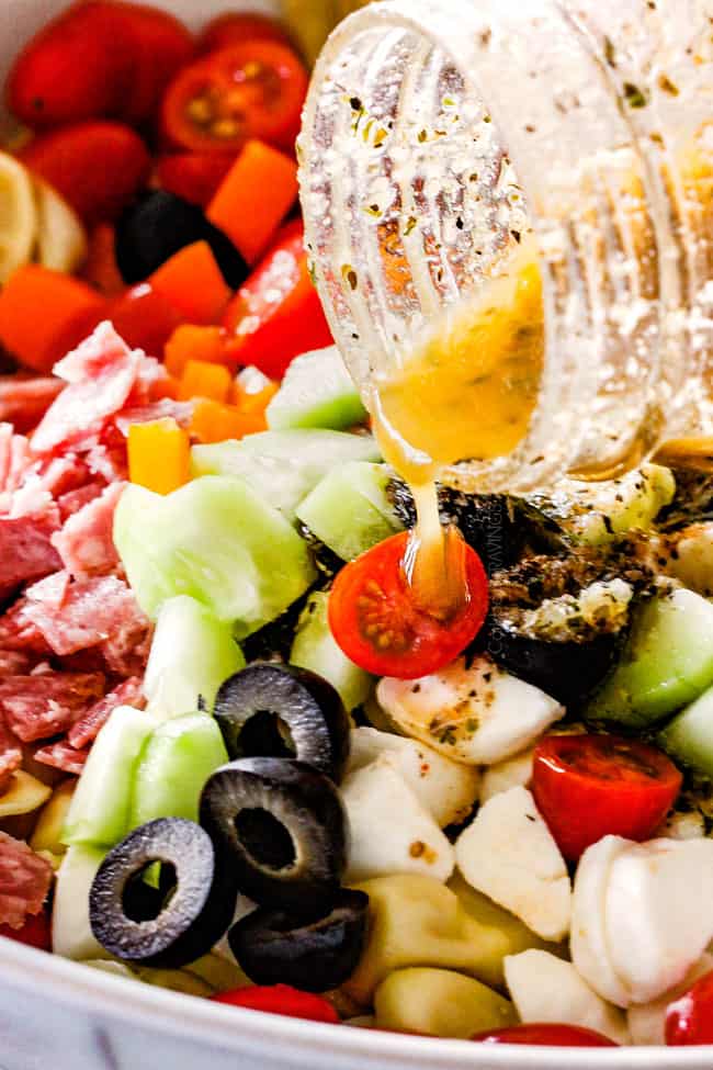 โขAfter pasta is drained, immediately add it to a large bowl then toss it with half of the dressing. By tossing it with dressing while itโs still slightly warm, it soaks in even more zesty flavor and the dressing also keeps the tortellini from sticking together.