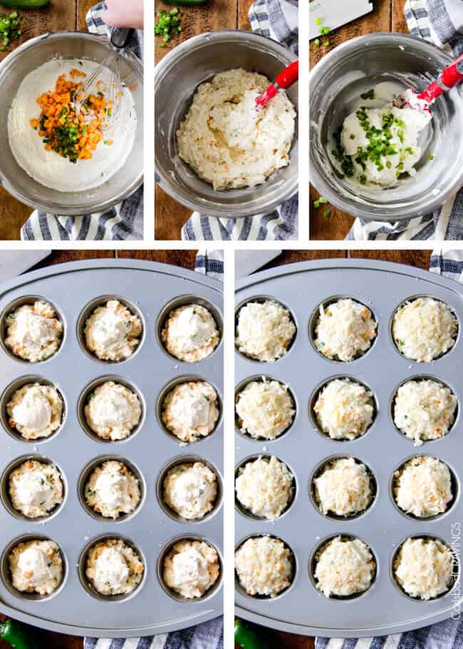 - Add a heaping tablespoon batter to each muffin cup and spread out slightly, followed by a heaping tablespoon cream cheese mixture then top with remaining batter. Sprinkle evenly with remaining Parmesan cheese.