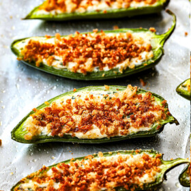 These Baked Jalapeno Poppers boast the holy trinity of appetizers: creamy, cheesy, crunchy with a hint of spice AKA wickedly addicting. They are also incredibly simple to prepare and can be prepped ahead of time then just popped in the oven.ย To make, fresh jalapenos are sliced in half and loaded with a tantalizing cheesy, cream cheese filling then topped with golden panko and baked to roasted, bubbly, crispy, creamy, spicy, cheesy perfection.ย This combination hits the โwowโ spot every time โ for everyone โ and is quite possibly the best appetizer ever โ even better than fried!ย I canโt wait for you to take one hot, creamy, crunchy bite, and see if you donโt agree. ย