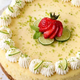 I am not a huge fan of key lime pie in general but this cheesecake is fabulous! I made it for my SILโs birthday and it was absolutely perfect! I candied some limes to decorate with the whipped cream topping and sprinkles of lime zest.