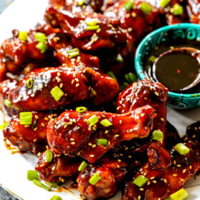 Game season is here which means appetizers galore!ย Iโm not hugely into football but I am hugely into football food.ย Do you have a favorite?!ย From my Chili Cheese Dipย and my Bacon Jalapeno Popper Dip,ย to myย Slow Cooker Barbecue Ribsย and Philly Cheesesteaks, to my Honey Buffalo Meatballs and Bacon Ranch Cheese Ball, itโs hard to pick a favorite โ and I guarantee you wonโt be disappointed in any of those choices, but first, you should start with these Korean Chicken Wings โ you NEED them in your life! ย Hereโs why: