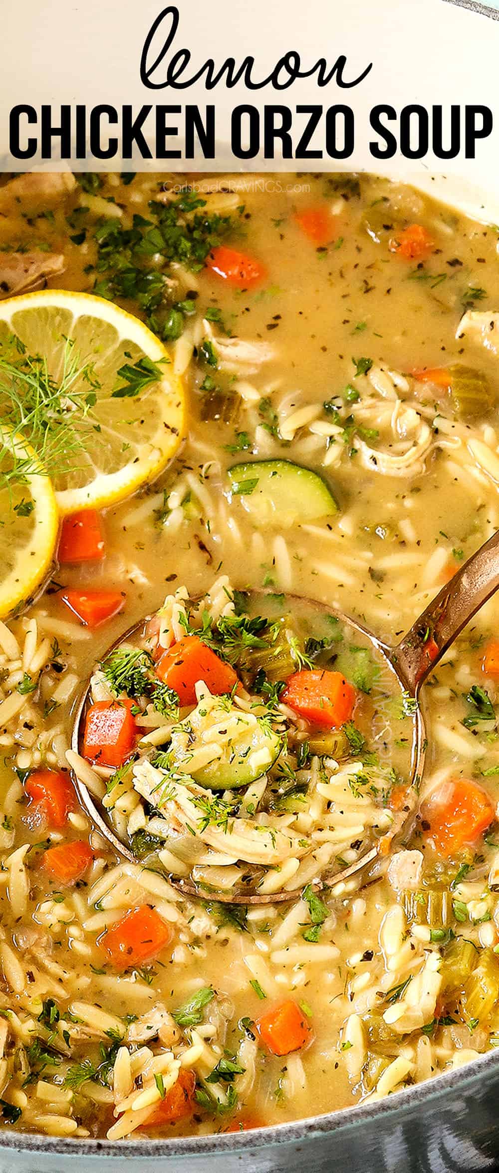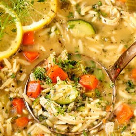 This lemon chicken orzo soup is refreshing, comforting, simple to make, nutritious and extremely versatile. Itโs a one pot wonder loaded with everyday ingredients of juicy chicken, tender orzo, carrots, celery, and zucchini in a vibrant lemony broth laced with fresh dill and Parmesan. This lemon chicken orzo soup is also extremely versatile โ swap the orzo for pasta, rice or lentils, the chicken for ground chicken or rotisserie chicken and the veggies for your favorites. This orzo soup also makes a great freezer friendly meal, just leave out the orzo and add it when you are ready to eat the soup.ย Serve your lemon chicken orzo soup withย dinner rollsย andย saladย for a complete feast!
