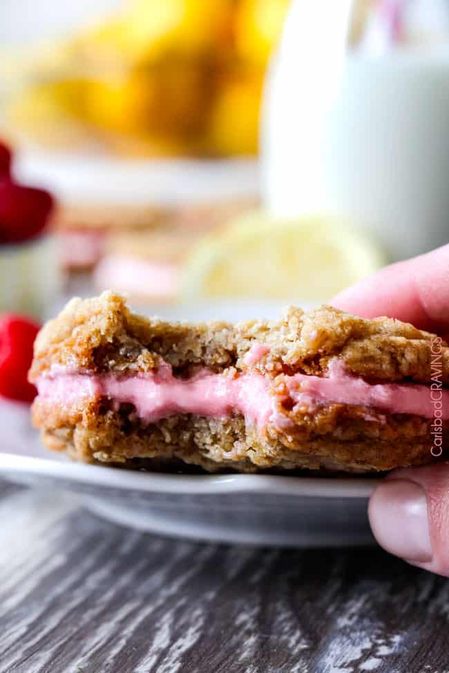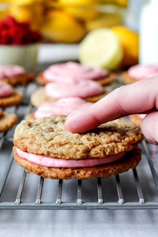 And then that magic moment when two large, soft, delicate, chewy, buttery, lemonย oatmeal cookies unite sandwiching raspberryย creme frosting filling that oozes to delight with each melt-in-your-mouth bite.
