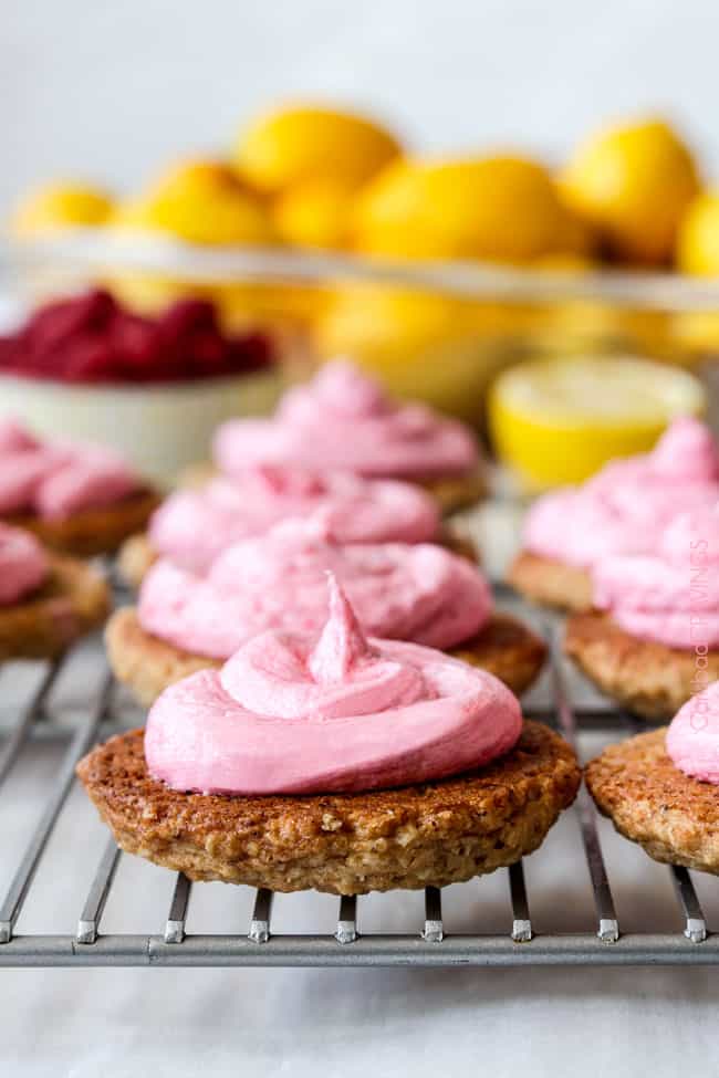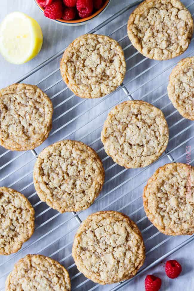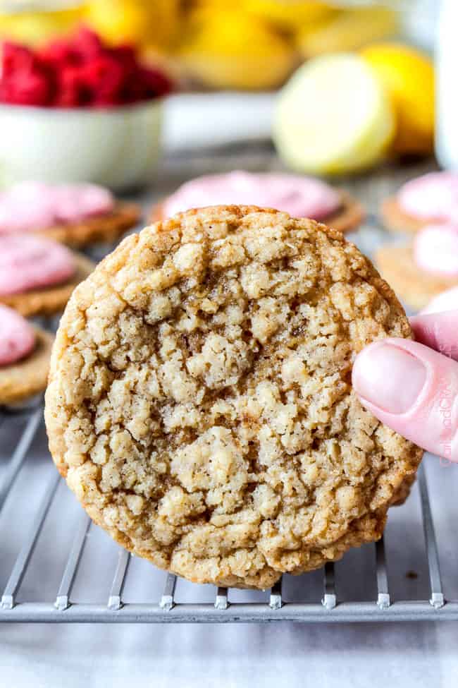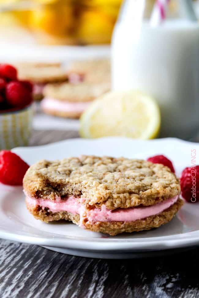 The spring/summer version of Little Debbiesโ Oatmeal Creme Pies! Soft and chewy buttery lemon oatmeal cookies sandwiching creamy raspberry frosting. ย The reason for raspberries. ย And lemon. ย And summer!
