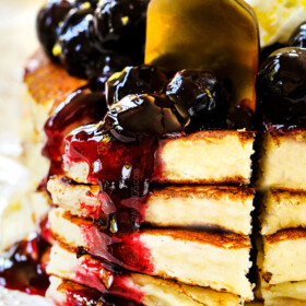 Lemon Ricotta Pancakes are some of the best pancakes youโll ever eat!ย Theyโre melt-in-your-mouth soft and tender due to the ricotta, bright and tangy due to the lemon juice and lemon zest and over-the-top sensational with the homemade blueberry sauce. Best of all, these Lemon Ricotta Pancakes may look fancy and taste fancy but take minutes to whip up!ย ย Theyโre perfect for lazy Spring and Summer mornings or special occasions like upcoming Fatherโs Day. Letโs ricotta!