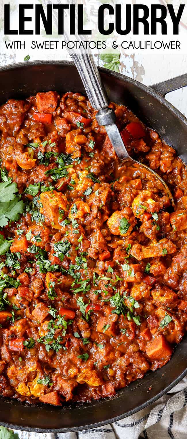 This lentil curry recipe is sensationally delicious, ridiculously easy and will satisfy even your toughest critic! ย Itโs loaded with exotic spices, tender lentils, sweet potatoes, carrots, bell peppers and cauliflower all simmered with crushed tomatoes, fire-roasted tomatoes and creamy coconut milk. The emerging coconut lentil curry is unabashedly flavorful and layered with both indulgently creamy and hearty textures that will make your taste buds swoon. This lentil curry recipe is made with easy to find ingredients, versatile veggies and takes less than an hour from start to finish, and most of that time is hands off simmering!ย It also makes fabulous leftovers to meal prep or freeze.ย Serve this lentil curry over rice, cauliflower rice, zoodles, etc. with Greek yogurt and naan and prepare for restaurant delicious lentil curry!