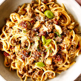 This Linguine recipe is guaranteed to become a repeat family favorite!ย Itโs easy, creamy, comforting, flavorful and lick-the-plate scrumptious! ย This Linguine recipe is busting with al dente pasta and hot Italian sausage enveloped in DIVINE creamy sun-dried tomato, artichoke sauce AKA you will not believe the deliciousness coming out of your kitchen! ย This Linguine pasta is creamy addictive comfort food that also happens to be extremely versatile so you can swap the artichokes with your favorite veggies or swap the sausage for your favorite protein or omit it altogether. ย The Linguine noodles also reheat beautifully for make ahead dinner or meal prep or lunches throughout the week โ because one meal is not enough.