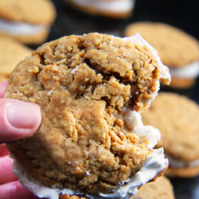 Remember when I said I wasnโt much of a sweets person? ย Well, maybe it just takes the most insanely delicious sweets to entice me because with these Oatmeal Cream Pies I was licking the beaters, licking my fingers, scraping the bowl, eating cookies fresh out of the oven (the cookies alone are going to be your favorite oatmeal cookie ever!!!).ย If I werenโt planning on taking these cookies to someone, they wouldnโt have lasted another hour.