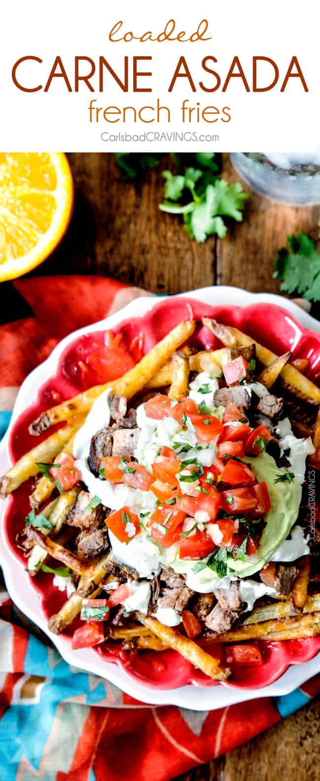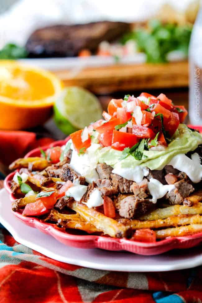 With the epic Big Game coming up, I only thought it right I share an appetizer/meal with epic big flavors. ย And these Loaded Carne Asada Fries, my friends, are epic.ย ย Living in Carlsbad, (north San Diego), where Mexican restaurants outnumber any other type of cuisine 20-1, ย I have tasted my share of Carne Asada Fries recipes, and this recipe outshines them all.ย