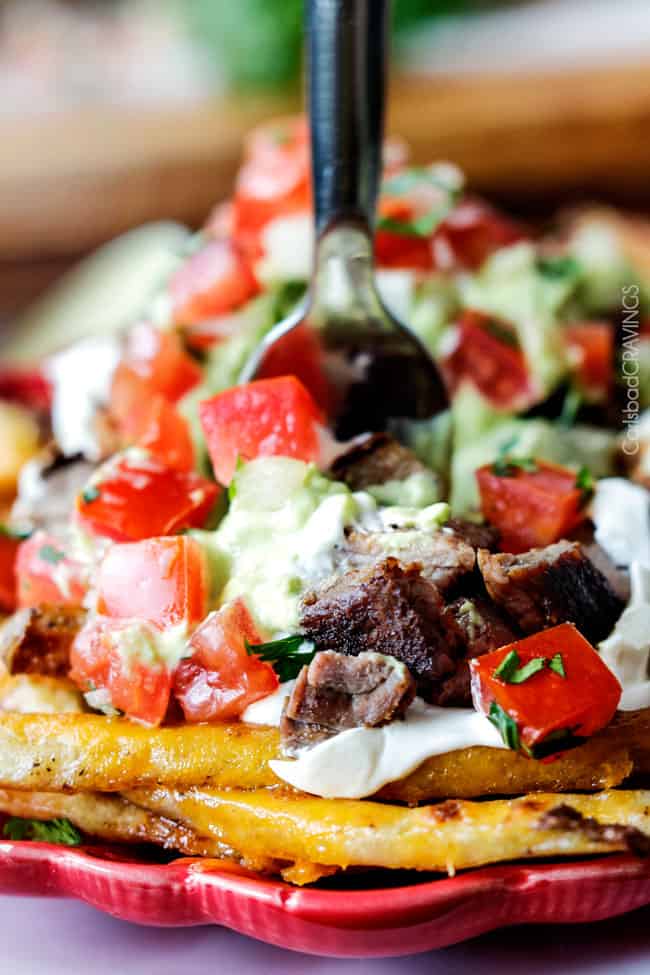 5.ย THE AVOCADO CREMA.ย Finally, the crowning glory of these Loaded Carne Asada Fries is the obsessive worthy, silky Avocado Crema. Both Patrick and I are obsessed with this Crema!ย Itย so creamy that weย prefer it hands down โ way down โ to guacamole.ย I have shared it in numerous recipes from Chili Lime Chicken Tacos to my Blackened Fish Tacos because it simply makes everything better and makes these Carne Asada Fries truly epic.