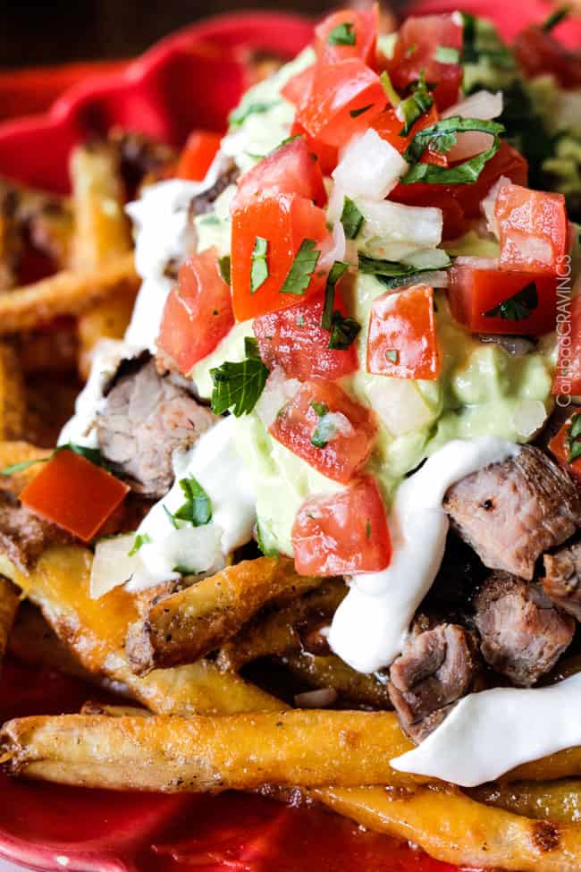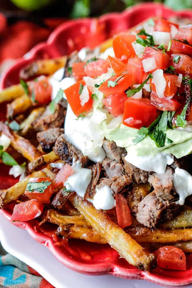 Carne Asada Fries are baked Mexican spiced French fries smothered in cheese and piled high with tender juicy marinated steak, salsa, avocado crema and whatever else your heart desires. ย Droolโฆ.