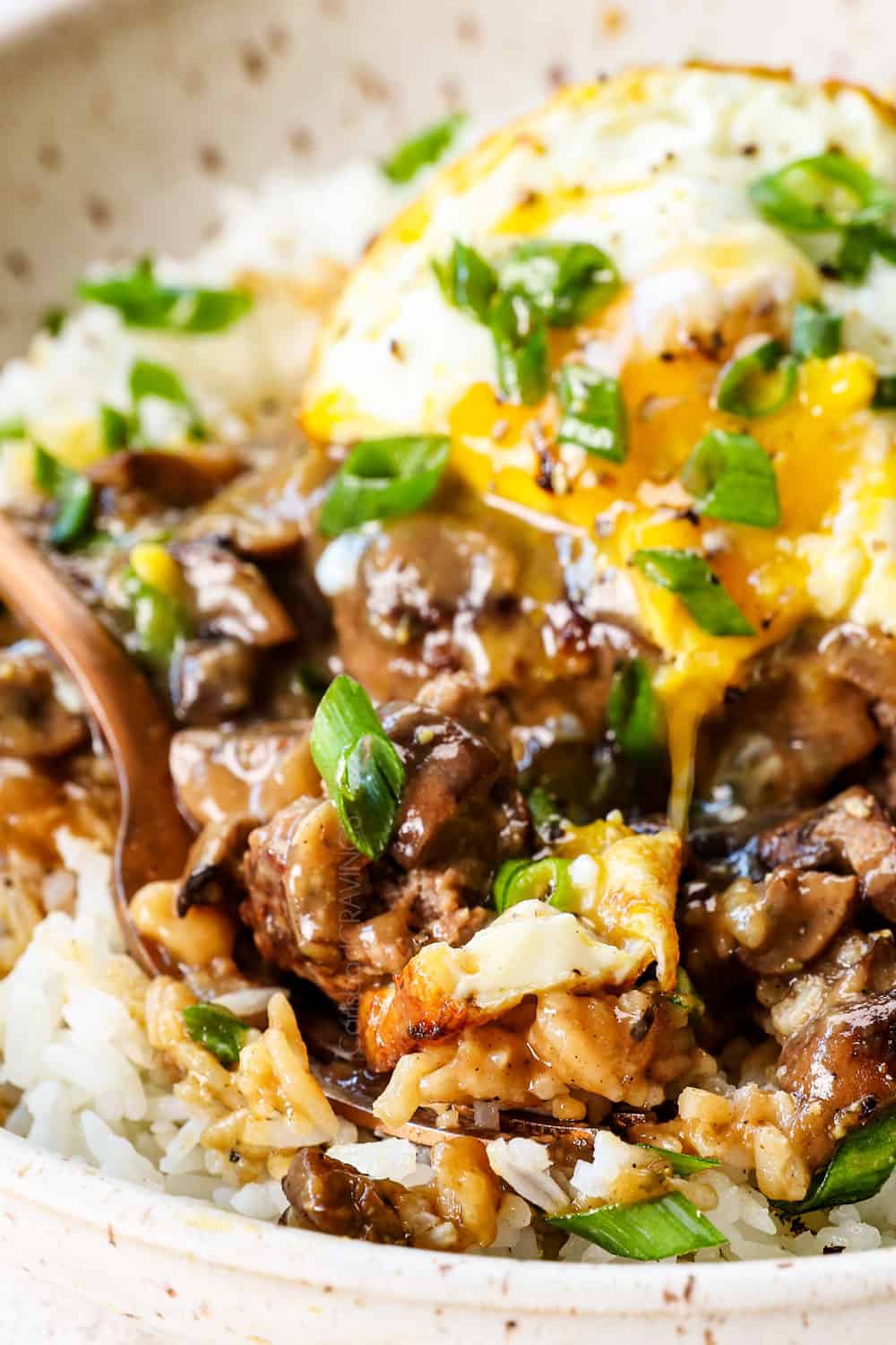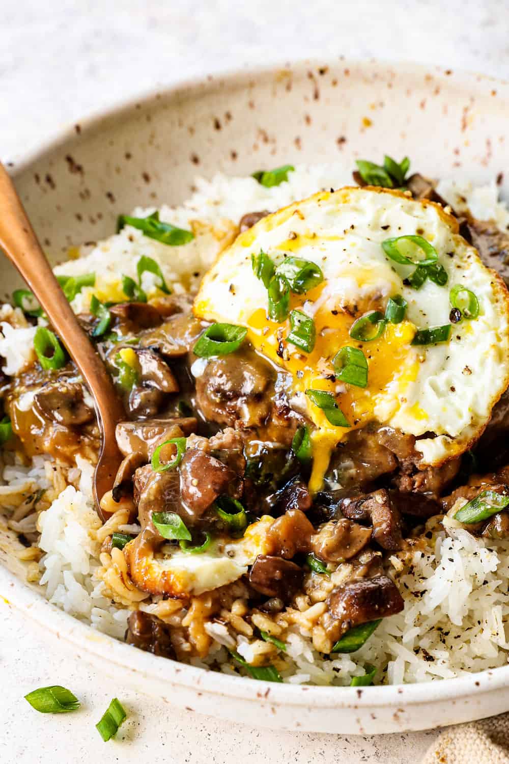 What sets this particular Moco Loco recipe apart is plenty of thick, luscious, flavorful mushroom gravy. There is more gravy than other recipes for better proportions of burger to gravy โ because youโre going to want ALL the gravy.