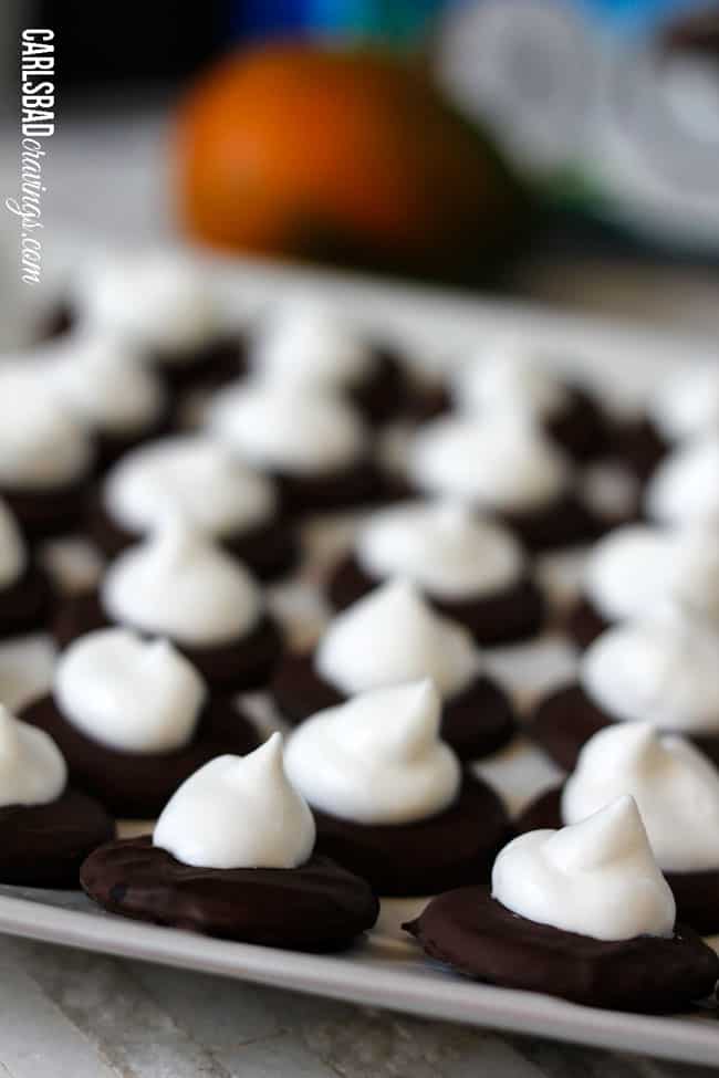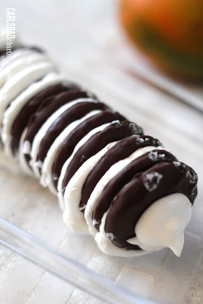 - Drop 1 heaping teaspoon of the coconut whipped cream onto each Coconut Delight Oreo Fudge Creme cookie. On a long serving platter, press the cookies together on their sides to form a long log. Cover the log with the remaining coconut whipped cream. Cover with plastic wrap and refrigerate at least 6 hours up to overnight.