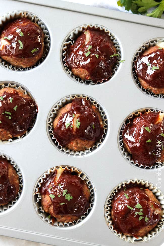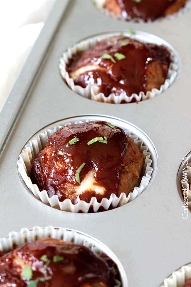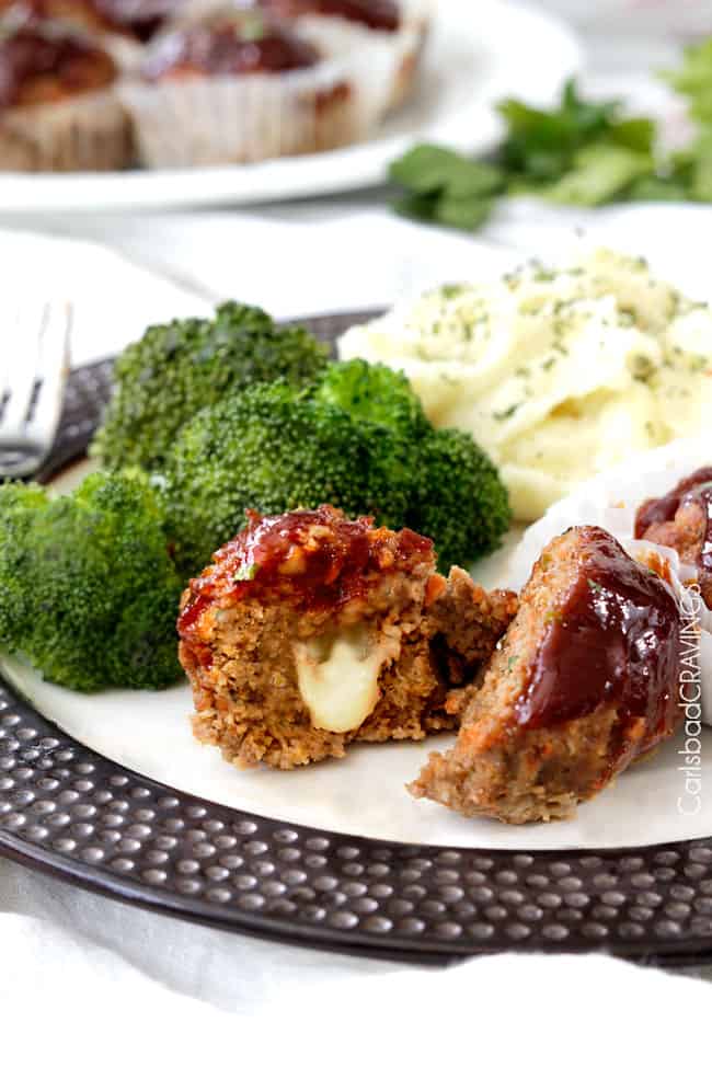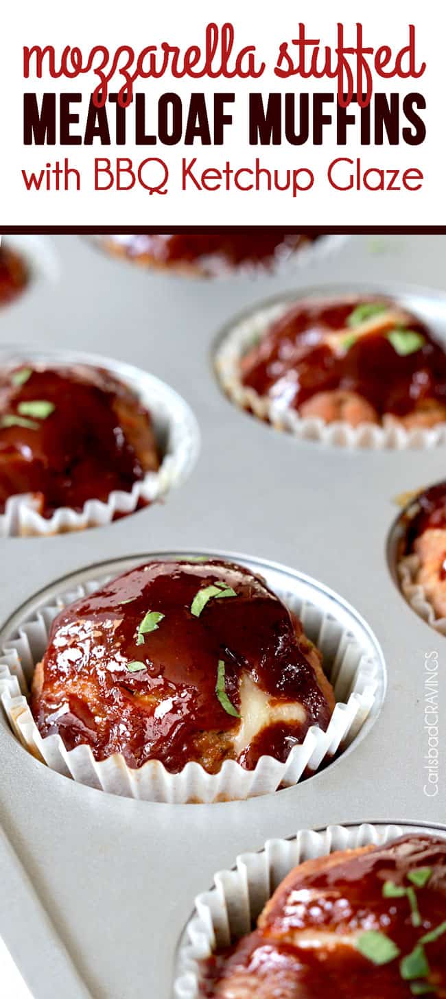 Mozzarella Stuffed Meatloaf Muffins ย โ each bite a perfect proportion of moist, spiced BBQ Ketchup Glazed meatloaf that will have you craving โmore meat!โ ย โmore meat!โ