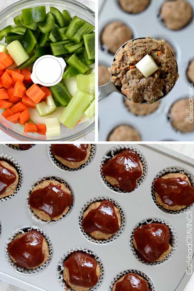 - Add roughly chopped onion, green bell pepper, celery, carrot and garlic cloves to your food processor and finely chop. Add to large bowl along with the remaining Meatball Muffin ingredients and mix until well combined.**