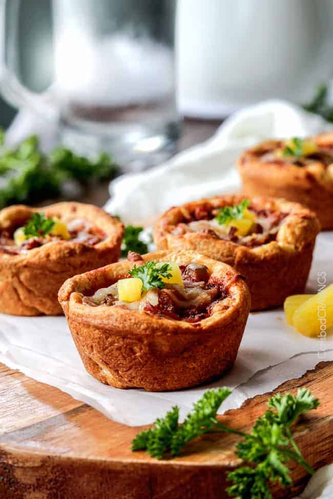 Donโt you just love bite size foods?ย From my Artichoke Dip Bites to Buffalo Popcorn Chicken, to my Cheesy Meatball Sliders, mini everything is just so fun โ not to mention easier to eat!ย So for these mini pizzas, I went with my favorite Hawaiian pizza.