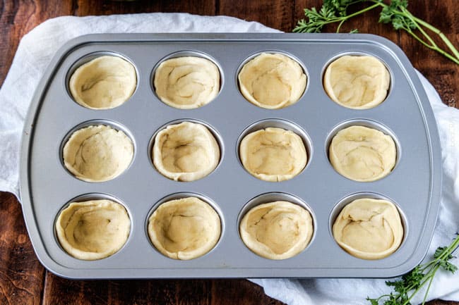 - When pressing the crescent rolls into the muffin cups, I find it easiest to press a corner on the short side of the triangle crescent together with the longest point of the triangle to form a cup before placing in muffin tin.