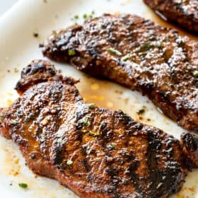 - New York Strip Steak:ย the recipe calls for 2 steaks, but you can scale the number up or down by using the arrows next to the servings in the recipe card depending on your needs. This will automatically scale the seasonings/butter measurements.