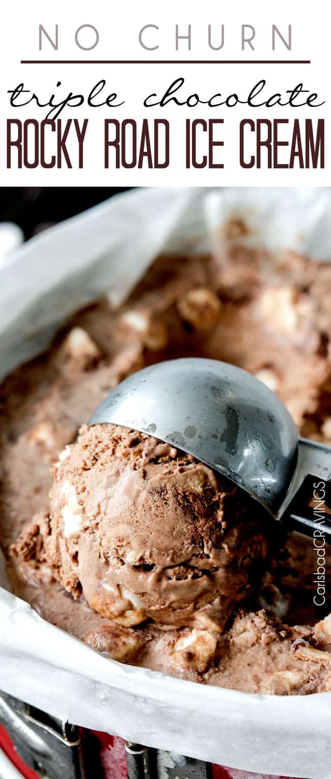 I adore Rocky Road so much that I never buy it because it will call to me โ nay, scream to me until itโs gone โ eat me!ย Eat me!ย Eat me! ย And as soon as I made this homemade rocky road ice cream recipe, it proceeded to to do just that. And I donโt blame it. I actually thank it. Sorry, Patrick. ย More decadent Triple Chocolate Rocky Road for me.