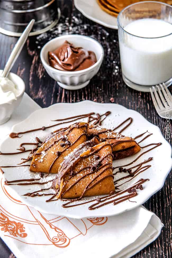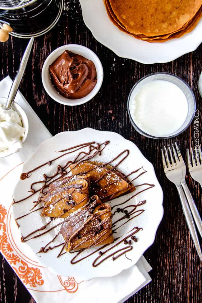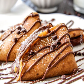 EASY one bowl Pumpkin Crepes are so much better than plain crepes!! ย Smother in silky, chocolate Nutella or stuff with cream cheese, or douse in syrup โ amazing any way your serve them!